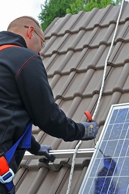 Deshalb sind angelehnte Leitern eine gefährliche Unfallquelle. Und wenn schon eine Leiter, dann muss sie gut auf dem Boden stehen, um nicht zu kippen. Auch sollte der Installateur beide Hände frei haben für das Werkzeug und die Anlage. Häufig genutztes Werkszeug kann man an den Hüftgurt binden, dann fällt es nicht vom Dach.