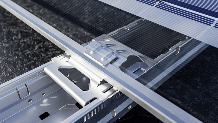 Jedes montierte Solarmodul wird an zwei Schieneneinheiten befestigt und ist an der Längsseite des Rahmens eingeklemmt. Jedes Modul wird von zwei Einheiten unterstützt, was sich besonders für große Solarmodule eignet. Aufgrund der Stabilisatoren zwischen den Schienen ist das System modulunabhängig.