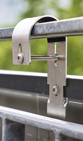 Drei Laschenpaare sorgen für den individuellen Abstand zwischen Modul und Handlauf des Balkongeländers. Die Bügel sind statisch berechnet und tragen eine Ü-Kennzeichnung. Der Modulwechselrichter kann, je nach Bauweise, an einem der drei pro Modul erforderlichen Befestigungsbügel angebracht werden.