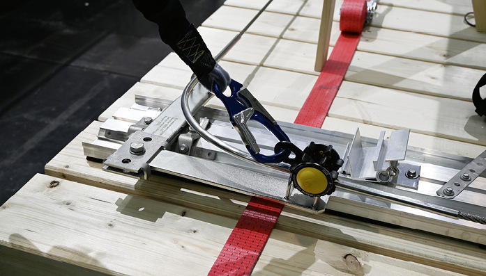 Jeweils in den Eckbereichen läuft das Stahlseil durch Kurvenelemente mit einem Biegeradius von 90 bis 135 Grad. Dies ermöglicht es dem Handwerker, auch um die Ecken der Anlage zu laufen, ohne dass er sich aus- und an anderer Stelle wieder einhängen muss.