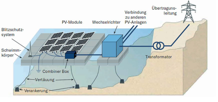Das hält die Leitungswege kurz. Sind die Wechselrichter an Land installiert, muss die DC-Hauptleitung vom schwimmenden Modulfeld zur Wechselrichterstation gesondert abgesichert sein: Dann ist die PA-Schiene der Schwimmkonstruktion mit der Haupterdungsschiene des Stromanschlusses an Land zu verbinden.