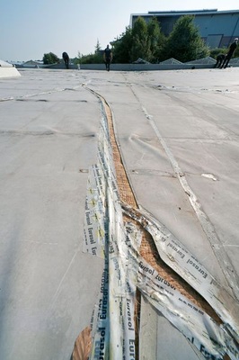 Dabei muss man bedenken, dass das Flachdach zu den am meisten beanspruchten Teilen eines Gebäudes gehört – auch ohne Solaranlage. Die ungeschützten Folien sind allen Wetterereignissen direkt ausgesetzt. Sie müssen übers Jahr betrachtet Temperaturschwankungen von plus 60 bis minus 20 Grad aushalten. Eine Untersuchung der Stadt Zürich an über 300 Flachdächern im Jahr 2007 hat ergeben, dass Undichtigkeiten bereits in den ersten fünf Jahren auftreten können. Schwachpunkte sind Dachdurchbrüche wie Lichtkuppeln oder andere Aufbauten sowie das Verspröden der Dachhaut. Das betrifft in besonderem Maße Dachabdichtungsbahnen aus Bitumen und PVC. Die Schäden treten in heißen Sommermonaten oder bei strengem Frost auf. Mit zunehmender Kälte verlieren die Materialien ihre Elastizität und können eventuell brechen. „Allein nach diesem sehr kalten Winter habe ich einige Bilder von Photovoltaikanlagen auf 20-jährigen homogenen PVC-Bahnen bekommen“, sagt Martin Meyer. „Bei einem knackigen Winter ohne Schnee können bestimmte Dachbahnen platzen – das ist dann ein Scherbenhaufen auf dem Dach.“ Hersteller von Kunststoff-Dachdichtungsbahnen wie FDT und Sika empfehlen deshalb besonders robuste, weichmacherfreie Materialien, wenn es an die Vorbereitung eines Flachdaches für die Photovoltaikinstallation geht. FDT setzt auf Polyisobutylen, kurz PIB genannt. Die Bahnen sind anderthalb Millimeter dick und werden mit heißluftverschweißten Nähten montiert. Auf der Unterseite befindet sich ein Kunststoffvlies. PVC-Bahnen als Untergrund für Photovoltaikanlagen würde FDT seinen Kunden nicht anbieten. Sika empfiehlt flexibles Polyolefin (FPO) mit einer Stärke von mindestens zwei Millimetern, ebenfalls mit einer Unterseite aus Vlies. Der Haken sind die Mehrkosten, die der Bauherr für das hochwertige Material erst einmal aufbringen muss.