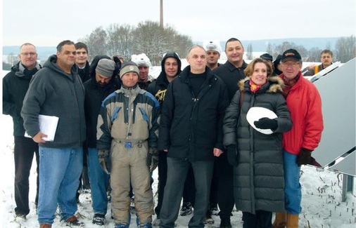Die Installation dieser Fullsize-Module in Neustadt sollte ein Testlauf sein: Wie viel Zeit lässt sich mit der halbautomatisierten Montage der Großmodule gegenüber dem üblichen manuellen Aufbau von kleinformatigen Produkten sparen? Eine Frage, die an jenem Dezembertag allerdings unbeantwortet blieb, weil die arktischen Minusgrade Gehrlicher einen Strich durch die Rechnung machten. Denn bei Temperaturen von acht Grad unter null musste der Hebekran, der die Module auf das Montagesystem hätte platzieren sollen, in der Garage bleiben, da die Vakuum-Saugnäpfe bei der Kälte nicht zuverlässig arbeiten. So blieb keine andere Wahl, als die 100 Kilogramm schweren Module von Menschenhand auf die Tragekonstruktion zu wuchten.