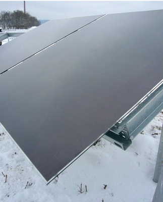 Ein sibirischer Ostwind pfeift über die Äcker und Wiesen vor den Toren Neustadts bei Coburg, tief hängen die Wolken über den Fluren Oberfrankens. Sechs vermummte Männer stapfen mit schwerer Last durch ein verschneites Feld; dicke Jacken, Mützen und Handschuhe schützen sie vor der Kälte. Die Männer schleppen ein Garagentor über den Acker. Ein Garagentor? Nein, ein elegant-anthrazitfarbenes Fullsize-Modul aus der SunFab-Produktionslinie von Applied Materials, das mit einer Größe von 2,6 mal 2,2 Metern und einer Fläche von 5,7 Quadratmetern wahrlich Garagentorgröße hat.