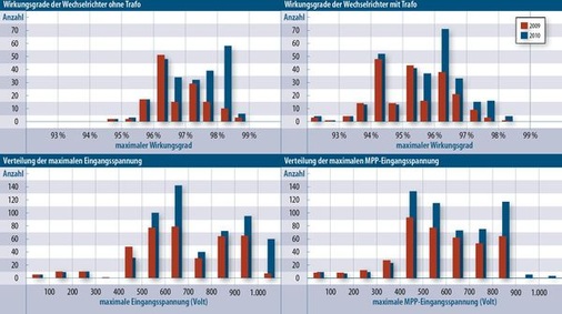 Augenfällig ist, dass sich der Wirkungsgrad innerhalb des letzten Jahres wieder verbessert hat. Gab es bei den trafolosen Wechselrichtern im Jahr 2009 nur ein Dutzend mit einem maximalen Wirkungsgrad von über 98 Prozent, sind es dieses Jahr schon über 60 Modelle. Mehr als die Hälfte der Modelle liegt über 97 Prozent. Im Mittel sind sie einen halben Prozentpunkt besser geworden.