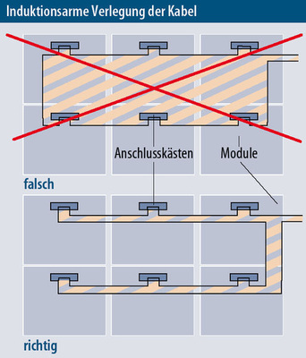 Der innere Blitzschutz hält ein gleichmäßiges Spannungsniveau in der gesamten Anlage aufrecht und verhindert so Schäden durch Überspannung. Denn Anlage und Wechselrichter können genauso geschädigt werden wie Computer und alle anderen elektronischen Geräte eines Haushaltes. Da Überspannungsschäden viel häufiger sind als direkte Blitzschläge – laut Angaben der Mannheimer Versicherung wurden im Zeitraum von 2003 bis 2005 sogar 45 Prozent der Schäden an Photovoltaikanlagen durch Überspannungen ausgelöst – ist der innere Blitzschutz empfehlenswert. „Nicht jede Versicherung übernimmt automatisch auch Schäden durch Überspannung. Wer seine Photovoltaikanlage über die Gebäudeversicherung mitversichert hat, sollte prüfen, ob in ihr auch Überspannungsschäden versichert sind“, sagt GDV-Mann Schweda. Der Überspannungsschutz beginnt bereits bei der elektrischen Verbindung der einzelnen Modulreihen. Die Leitungen sollen keine großen Schleifen aufmachen, sondern leicht verdrillt dicht nebeneinander verlegt werden. Damit wird die Möglichkeit der Einkopplung von Überspannung gemindert. Außerdem sollte das Generatorgestell mit der Erdung verbunden werden, über einen Kupferdraht von mindestens 16 Millimeter Durchmesser, der außen am Gebäude in die Erde geführt wird. Erder und Potenzialausgleich des Gebäudes sind miteinander zu verbinden. „Der Blitzschutz wird zu 95 Prozent falsch installiert“, sagt Blitzschutzexperte Gawehn. „Und daraus resultiert eine Vielzahl von Schäden. Den inneren Blitzschutz wissen selbst sehr viele elektrische Sachverständige leider nicht funktionsfähig zu installieren.“