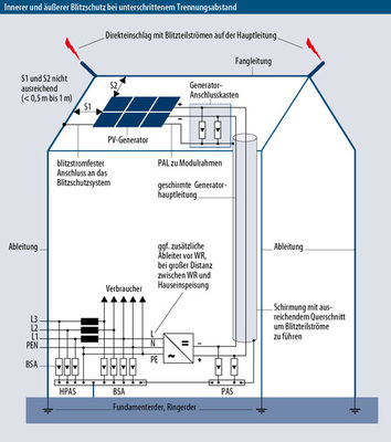 Hier hat sich in vielen Merkblättern zum Thema Blitzschutz ein Fehler eingeschlichen. Häufig bezieht man sich auf einen Grenzwert von 1,50 Metern. „In der Empfehlung des VDE steht eindeutig: größer 30 Zentimeter, und nicht 1,50 Meter,“ sagt Gawehn. "Das ist bedenklich, denn schon sagt sich der Photovoltaiker: Meine Aufständerung beträgt doch nur 1.20 Meter, und glaubt sich auf der sicheren Seite.“ Und handelt sich in Wirklichkeit das Risiko eines direkten Blitzeinschlages ein – unabhängig davon, ob die Anlage auf einem Flachdach oder auf einem Schrägdach angebracht ist. Wenn ein äußerer Blitzschutz zusammen mit der Photovoltaikanlage neu installiert wird, werden die Fangeinrichtungen so bemessen, dass sich die gesamte PV-Anlage im Schutzbereich befindet. Das gilt natürlich auch, wenn eine neu zu errichtende Anlage und ein bereits bestehender Schutz aufeinander abgestimmt werden. Das lässt sich nicht durch Schätzungen lösen, sondern bedarf spezieller mathematischer Anwendungen, wie beispielsweise des Blitzkugelverfahrens. Damit innerhalb dieser Schutzzone keine Ströme vom Blitzableiter auf die Photovoltaikanlage überspringen, muss der Trennungsabstand „s“ zwischen den Fangstangen, deren Verbindungen und der gesamten PV-Anlage eingehalten werden. Er beträgt zwar in der Regel zwischen einem halben und einem Meter, muss aber genauso wie die Schutzzone über eine Formel genau berechnet werden.