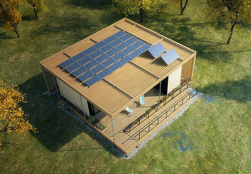 Studenten der Technischen Universität in der tschechischen Hauptstadt Prag haben sich der Bedürfnisse der Generation angenommen, deren Kinder schon auf eigenen Beinen stehen. Das „Air House“ ist für zwei Personen konzipiert. „Tschechische Senioren können es als Wochenendhaus nutzen, solange sie noch nicht in Rente sind, oder es als ständigen Wohnsitz nutzen, wenn sie in Rente gehen“, erklären die Prager das Konzept. Durch seinen einfachen Aufbau, die geringe Größe und die unkomplizierte Form passt das Gebäude in jeden Garten. Das Innenraumkonzept beruht auf einer flexiblen und modularen Wohnraumaufteilung. Die Küche und Speicher sind separat angeordnet. Auf dem Dach sind insgesamt 30 multikristalline Solarmodule aufgeständert. Sie erreichen eine Gesamtleistung von 5,5 Kilowatt, die ausreicht, um das gesamte Gebäude mit Strom zu versorgen. Für genügend Wärme sorgen zwei Flachkollektoren auf dem Hausdach und ein Wärmespeicher im Vorratsteil des Gebäudes. Die Anlage kann im Sommer die Versorgung des Hauses mit Warmwasser komplett übernehmen. Im mitteleuropäischen Winter reicht sie aus, um zehn Prozent des gesamten Bedarfs an Warmwasser und Raumwärme abzudecken.