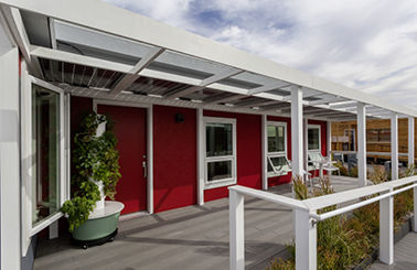 Die Energie für die Bewohner liefert ausschließlich die Sonne. Eine Photovoltaikanlage mit Ost-West-Ausrichtung auf dem Flachdach liefert nicht nur genügend Strom für die Hausbewohner, sondern gibt dem Dach auch eine ganz spezielle Optik, die an ein Sheddach erinnert. Das solarthermische System reichte leider nicht ganz aus, um die Anforderungen zu erfüllen, die die Jury des Solar Decathlon an die Warmwasserbereitung stellte.