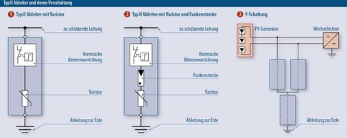 Diese Geräte gibt es in je drei Typen für Gleich- und Wechselstrom. Typ I ist für die höchsten Belastungen ausgelegt. Er wird verwendet, wenn das Haus einen äußeren Blitzschutz besitzt. Überspannungsschutz Typ II ist für geringere Ableitströme ausgelegt. Ihn installiert man beispielsweise vor und nach dem Wechselrichter, Typ III schützt einzelne untergeordnete Segmente oder Geräte. In vielen Wechselrichtern ist heute bereits ein Überspannungsschutz integriert, der aber häufig nur für die internen Strukturen ausreicht.