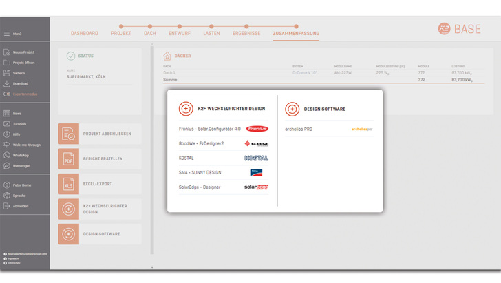 Die neue Version von K2 Base macht die PV-Planung damit noch schneller und einfacher. Wie gewohnt erfolgt die kostenlose Auslegung in der Online-Software von K2 Systems über die bewährten fünf Schritte: Projekt, Dach, Entwurf, Lasten und Ergebnisse.
