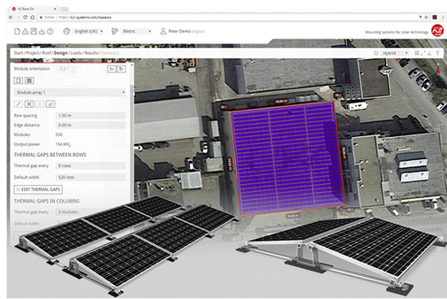 Die neue Online-Software Base On von K2 Systems greift auf die Satellitenbilder von Google Maps zurück und ermöglicht durch grafische Zeichenwerkzeuge eine schnelle Vermessung des gewünschten Dachs. Ebenso werden Modulfelder und mögliche Verschattungsbereiche mit wenigen Klicks eingearbeitet sowie die passenden Schnee- und Windlasten automatisch berechnet. Die verbesserten Berechnungsgrundlagen, die unter anderem für geringere Ballastierungswerte sorgen, sind ein weiterer Vorteil der innovativen Software.