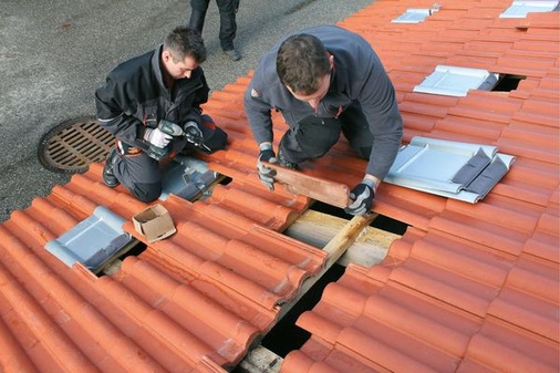 Das Display der Stoppuhr zeigt 09:16. Die unteren sieben Blechziegel samt Haken sind montiert, und die Original-Dachziegel über den Haken liegen wieder. Jetzt können die unteren Schienen für die Montage vorbereitet werden. Dazu steckt Schroth die Schienenteile auf dem Boden vor dem Dach ineinander, an den beiden äußeren Enden erhält der zusammengebaute Schienenstrang jeweils eine steckbare Abdeckung, die regendicht macht und die Optik verbessert.
