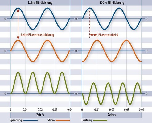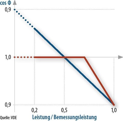 Um die Spannung zu stabilisieren, fordert der Richtlinienentwurf, dass auch die an das Niederspannungsnetz angeschlossenen Anlagen in Zukunft ab einer bestimmten Größe Blindleistung bereitstellen müssen (siehe Kasten Seite 119, Phasenwinkel, Blind- und Wirkleistung). Die neue Anwendungsregel legt dafür drei Stufen fest: Kleine Anlagen unter 3,68 Kilowatt Bemessungsleistung dürfen mit einem cos ? zwischen 0,95 und eins einspeisen, ohne dass der Netzbetreiber Vorgaben macht. Anlagen mit Leistungen zwischen 3,68 Kilowatt und 13,8 Kilowatt, die ab dem 1. Januar 2012 in Betrieb gehen, erhalten eine Kennlinienvorgabe des jeweils zuständigen Netzbetreibers, wobei der cos ? nicht unter 0,95 sinkt (siehe Kasten auf dieser Seite, Streitpunkt Leistungs-Phasenwinkel-Kennlinie). Für Anlagen größer als 13,8 Kilowatt lässt die Kennlinie einen größeren Bereich für cos ? zu. In dieser Leistungsklasse kann er auf 0,9 sinken.