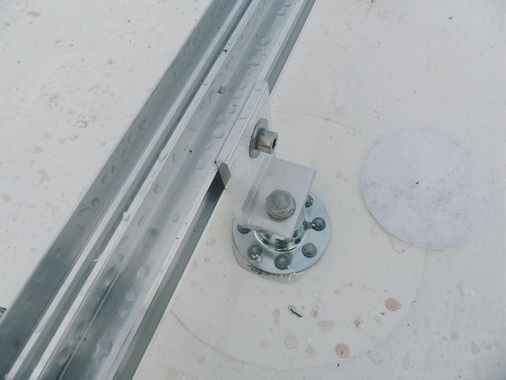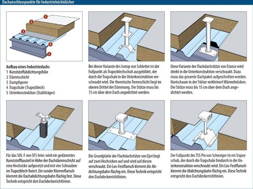 Igor Rauschen, Abteilungsleiter Photovoltaik von Pohlen Solar in Geilenkirchen, hat Sol-F in zwei Projekten eingesetzt – dort, wo eine Aufständerung nicht möglich war und die Module dachparallel montiert wurden. „Aus technischer Sicht ist das Bauteil gut“, sagt Rauschen, „man hat definierte Kräfte, die man in das Trapezblech einleiten kann.“ Auch die geringe Wärmeleitung sei ein Pluspunkt. Dass die bauaufsichtliche Zulassung des Deutschen Instituts für Bautechnik kurz bevorsteht, sprach ebenfalls für das Bauteil. Die zusätzlichen Kosten im Vergleich zur ballastierten Lösung bezeichnet er als gering: „Etwa 10 bis 20 Euro pro Kilowattpeak, mehr war das nicht.“ Mit der Ejot-Flachdachstütze hat ein weiterer Spezialist für Baubefestigungen seit 2011 eine Dachdurchdringung im Programm. Ejot befestigt seine Stütze ebenfalls auf der Tragschale aus Trapezblech. Dafür prüfen die Ingenieure zuerst, ob das Dach noch Lastreserven besitzt. „Bei unserer Vorbemessung ermitteln wir zuerst die Resttragfähigkeit des vorhandenen Trapezprofils in Verbindung mit den vorhandenen Binderabständen und möglichen Abhängelasten“, sagt Lothar Gens, Produktmanager bei Ejot, „nur wenn ausreichend Tragfähigkeit vorhanden ist, können auch weitere Lasten durch eine Photovoltaikanlage in die Konstruktion eingeleitet werden.“ Auf dieser Grundlage kann dann die Anzahl und Positionierungder Stützen erfolgen. Für die Installation der Ejot-Flachdachstütze wird die breite Fußplatte nach dem Aufschneiden von Dachhaut und Wärmedämmung auf zwei Hochsicken aufgelegt und dort verschraubt. Zum Vergleich: Das schmale SOL-F von SFS steht nur auf einer Hochsicke auf. Über eine Edelstahlschraube wird die Last in die Tragschale eingeleitet. Deren Kopfpunkt ist mit dem Unterteil eines Fest-Losflansches verbunden. Auch hier wird also die Dachfolie horizontal eingepresst. Der Übergabepunkt zum Photovoltaik-Montagesystem liegt ebenfalls nur fünf Zentimeter oberhalb der Dachhaut. Und wie sieht es mit dem Wärmeschutz aus? „Unsere Flachdachstütze ist aus Edelstahl gefertigt, daraus resultiert eine verminderte Wärmeleitfähigkeit“, sagt Gens. Außerdem sei unterhalb der Bodenplatte eine Schicht EPDM befestigt, das trenne thermisch gegen die Bildung von Kondenswasser.