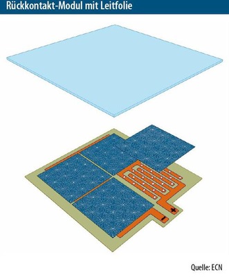 Nicht nur, dass die Entwickler von ECN die Leiterbahnen von der Zelloberfläche auf die Rückseite verlagert haben. Dadurch wird die Zelloberfläche weniger verschattet und der Wirkungsgrad des Rückkontakt-Moduls steigt um 0,3 Prozent. Der eigentliche Clou ist die Verwendung von leitendem Klebstoff auf der Rückseite. Er verbindet die Zellkontakte an über tausend Klebepunkten mit einer Folie, die von kupfernen Stromleitern durchzogen ist. Der Strom fließt durch den Kleber, genauso als wären die Kontakte gelötet, nur haben die Klebeverbindungen mehr Zukunftspotenzial. „Die reinen Herstellungskosten eines Moduls lassen sich mit der Klebetechnik auf einen Euro pro Watt senken“, ist de Jong überzeugt. Denn um dieses Ziel zu erreichen, müssen die Zellen dünner und größer werden. Ebenso müssen Materialkosten gesenkt und Prozesse zusammengelegt werden. Und das alles bei gleicher oder gar höherer Effizienz. All diese Voraussetzungen ließen sich mit dem Leitkleber erfüllen. Da er bereits bei einer Temperatur von 150 Grad Celsius aushärtet, eignet er sich für die dünnen kristallinen Solarzellen, wie sie in Zukunft hergestellt werden sollen. Denn beim Löten dehnen sich Lot, Metallbändchen und Silizium unterschiedlich stark aus. Kühlt die Lötstelle ab, kommt es zu hohen mechanischen Spannungen im Material, die dünne Zellen verbiegen und Mikrorisse im Silizium verursachen. Spätestens wenn die Zelldicke unter 150 Mikrometer liegt, wird Löten problematisch. Geklebte Verbindungen sind hingegen auch nach dem Aushärten flexibel. Sie halten mechanischen Belastungen besser stand als starre Lötverbindungen. Kleben schont aber nicht nur die empfindlichen Zellen. Bei 150 Grad Celsius bringen die Modulhersteller auch die Verkapselungsfolie auf die Solarzellen auf und könnten die Module nun in einem Schritt kontaktieren und laminieren.