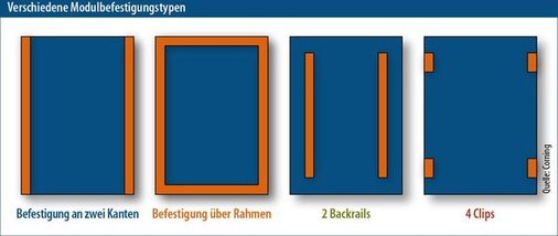 Aus der Testreihe ging ein weiteres Ergebnis hervor. „Wir müssen mit den Backrails nicht ganz bis zum Rand der Module gehen, sondern können rund vier Zentimeter Abstand lassen“, erklärt Tobias Tritsch, der die Schwing- und Schütteltests sowie Zugversuche in Zusammenarbeit mit der TU München durchgeführt hat. „Dadurch sparen wir eine Menge Material ein.“ Doch wie groß ist die Entlastung, die die rückseitig aufgeklebten Metallschienen den Modulen bereiten? Eindrucksvolle Zahlen liefert der US-amerikanische Glashersteller Corning. Außer dass das Unternehmen die Module, insbesondere deren dünnes Spezialglas, und deren Befestigung im Windkanal von Miami testet, führt es auch Simulationsberechnungen mit vier unterschiedlichen am Markt erhältlichen Befestigungssystemen für Dünnschichtmodule durch: mit einer Rahmung, mit linearer Klemmung entlang der zwei langen Kanten, mit Randklemmung an vier Punkten und mit einer Befestigung mit zwei aufgeklebten Backrails (siehe Grafik Seite 69 oben).
