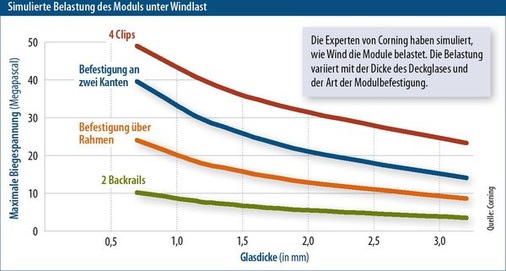 Die amerikanischen Wissenschaftler verglichen Modulaufbauten mit unterschiedlichen Glasstärken und errechneten Simulationen für jede der vier Befestigungsgeometrien. Dabei stellten sie Erstaunliches fest: Die Wahl der Befestigungsstruktur ist wichtiger für die Spannungen im Glas als die Glasstärke selbst. Im Vergleich zur punktuellen Befestigung mit Randklemmen sinken die Spannungen beim Einsatz von Backrails um das Fünffache (siehe Grafik Seite 69 unten). Cornings Fazit: Klemmen sind gut, rückseitig aufgeklebte Montageschienen aber viel besser.