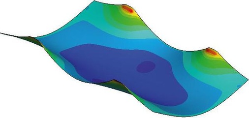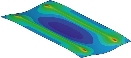 Das ist auch in den Biegungssimulationen von Gehrlicher Solar aus München zu sehen. Gehrlicher hat gemeinsam mit dem Dünnschichtproduzenten Enn Solar Module mit einem Backrail-Befestigungssystem entwickelt. Unter der größten denkbaren Lasteinwirkung sollen die 7,5 Millimeter starken Glas-Glas-Konstruktionen sich weniger als sechs Millimeter durchbiegen. Auch Gehrlicher erreicht das mit auf der Rückseite der Module aufgeklebten Metallschienen, die im Abstand von 60 Zentimetern zueinander angeordnet sind – das macht vier Metallschienen bei Großmodulen mit 5,7 Quadratmetern und zwei Schienen bei anderthalb Quadratmetern Modulfläche.