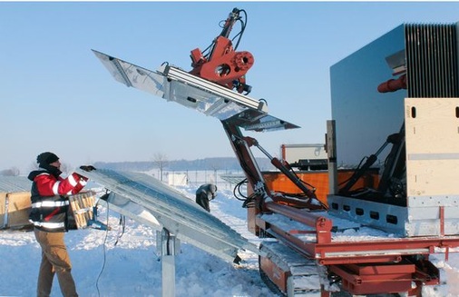 Er sieht aus wie ein Mondfahrzeug, mit Radketten, Greifarm und einer Kiste auf dem Rücken. Hier in Sprotta nördlich von Leipzig soll er das erste Mal richtig ran, 450 sogenannte Fullsize-Dünnschichtmodule verbauen. Sie sind viermal größer als normal, die Modulfläche beträgt jeweils 5,7 Quadratmeter. Damit wiegen sie 120 Kilogramm und bringen 480 Watt Leistung. Ohne den Gehrlicher Assembly Robot, wie Robby offiziell heißt, wäre die Montage momentan nicht möglich. Um den Arbeitsschutz zu gewährleisten, dürfen die Riesenmodule bei Schnee und Eis nicht per Hand montiert werden.