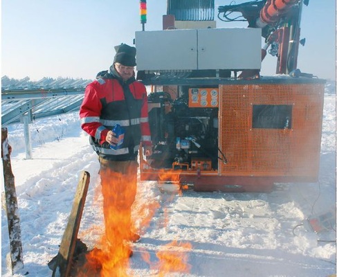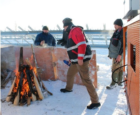 „Macht ein Feuer, um die Maschine aufzutauen.“ Nicht so einfach bei diesen sibirischen Temperaturen. Dazu müssen die Mitarbeiter Verpackungen zerlegen und das Holz angezündet bekommen.