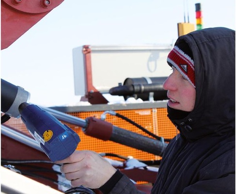 Rasch bauen die Mitarbeiter die Feuerstelle ab. Inzwischen greift der „Steuermann“ Daniel Schölling zur Konsole und gibt erste Kommandos an den Roboter. Probeweise rudert der ausladende Arm mit den Ansaugstutzen in der Luft und soll Drehungen vollführen wie später mit dem Modul, um es passgenau zu positionieren. Schnell stellt sich heraus: Ein kleiner Elektromotor am Greifarm ist noch eingefroren. Der Heißluftföhn hilft. Jetzt kann es wirklich losgehen.