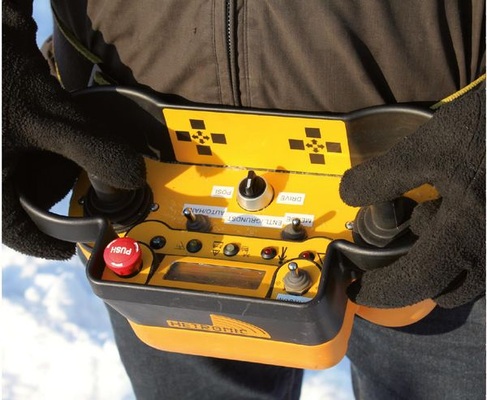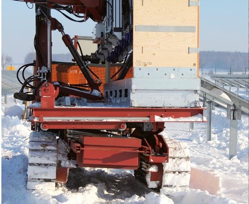 Zwei Monteure entfernen den hohen Schnee auf dem Weg vor den Untergestel len. Dann bringt sich die Roboterraupe in Position, um das erste Modul zu verlegen. Den unebenen Boden unter den Ketten gleicht eine Hydraulik aus. Der Roboter mit seiner in die Höhe ragenden Modulkassette steht automatisch gerade. Das Fahrwerk ist so konstruiert, dass es Schlamm, Sand, Steine und Schnee problemlos überfahren kann. An den Antrieb haben die Entwickler die gleichen harten Anforderungen gestellt wie bei Minenräumfahrzeugen und im Straßenbau.