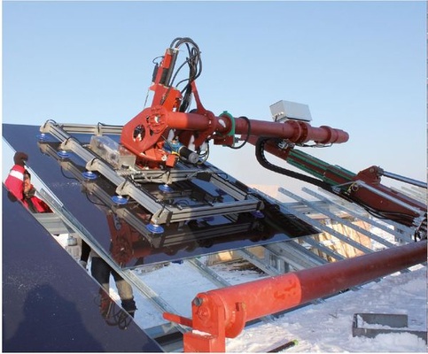 Jetzt ist alles klar für die Montage. Die Stoppuhr der photovoltaikläuft. Sie misst, wie lange dieser Vorgang für ein Modul wirklich dauert. Der Roboterarm wendet sich dem vordersten Modul auf der Kassette zu. Dann haften die sechs Saugnäpfe fest. Um zu verhindern, dass die schweren Module abstürzen und die Monteure erschlagen, hat auch beim Ansaugsystem Sicherheit die höchste Priorität. Langsam hebt sich die riesige Glasscheibe des Dünnschichtmoduls. Schon schwebt sie über den Köpfen.