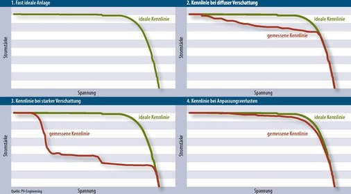 Dass die Anwender die elektrischen Sicherheitsbestimmungen einhalten, halten die Hersteller zwar zu Recht für selbstverständlich. Kiefer vom Fraunhofer ISE sieht aber trotzdem noch einen Nachholbedarf. Zwar würden Elektroinstallateure das nötige Grundwissen haben, um mit solchen Geräten zu arbeiten. In seinen Augen wird das Thema Schulung aber vernachlässigt. Dabei geht es nicht nur um die eigentliche Messung. Weiß der Anwender fachgerecht mit dem Gerät umzugehen, muss er danach noch die Kennlinien interpretieren. Nicht jedem ist bewusst, wie eine Stromspannungskennlinie im Idealfall verläuft, wie welcher Knick zu interpretieren ist und wann eine Kurve eine Auffälligkeit aufweist. Zwar sind Kennlinien und ihre Interpretation Teil verschiedener Solarausbildungen, doch ein Handwerker, der keine einschlägige Ausbildung absolviert hat, muss sich erst mit dem Thema vertraut machen.
