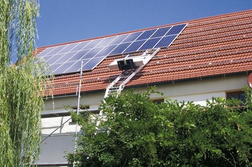 Gesundheitsschonender und preiswert ist ein Leiter-Seilaufzug. Der Gerüstebauer Layher beispielsweise bietet einen solchen Aufzug mit spezieller Ausstattung für Photovoltaikmodule an. Auf der Vorderseite der Leiter ist ein Materialwagen mit Gummiauflage angebracht. Das Modul wird auf den Wagen gestellt und von vorn befestigt. Jetzt zieht der Arbeiter den Wagen an einem Seil hoch. Auf dem Dach nimmt eine zweite Person die Ladung ab. Dieser einfache mechanische Aufzug eignet sich für kleine Baustellen.