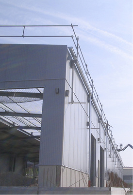 Das Flachdachseitenschutzsystem der Firma Sifatec kann auch bei Stahlhallen eingesetzt werden. Denn ebenso wie das Vernetzen wird von den Bauberufsgenossenschaften gefordert, dass am Rand eines Gebäudes Sicherungsmaßnahmen gegen Absturz ergriffen werden. Die Firma Simon hat ein System entwickelt, das einfach zu montieren ist und nahezu keine Störstellen auf der Dachfläche erzeugt. Dabei bildet das patentierte Einhängesystem, bestehend aus einer einfachen, aber innovativen Stahlblechplatte, die am Bauwerk verbleibt, und einem speziellen selbstsichernden Einhängebügel, das Herzstück dieses Seitenschutzsystems.