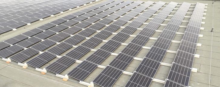 Das Montagesystem von Sun Ballast aus Italien bietet Stabilität und Sicherheit für die Photovoltaikanlage auf dem Dach. Das System bildet im Prinzip einen Verbund aus Ballast und Paneelen und ist schnell zu installieren. Es wiegt 20 bis 25 Kilogramm pro Quadratmeter inklusive des Paneels und hielt bei Tests im Windkanal Windlasten bis 150 Kilometer pro Stunde stand.