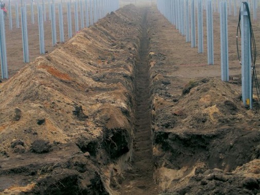 Ein Grund für eine lange Bauzeit ist, dass zuerst Gräben über die gesamte Baustelle gezogen werden müssen, unter anderem für die sogenannten Maschen für die Erdungsleitungen. Diese sollen üblicherweise wie ein Karo mit 40 mal 40 Metern Maschenweite unter den Modulen verlaufen. Während Bauarbeiter die Erdarbeiten ausführen, ist es kaum möglich, die Modulfundamente in den Boden zu rammen. Die Zeiten müssen genau abgestimmt werden. Verzögern sich die Grabungsarbeiten in einem Bereich, drehen die Gestellmonteure Däumchen.