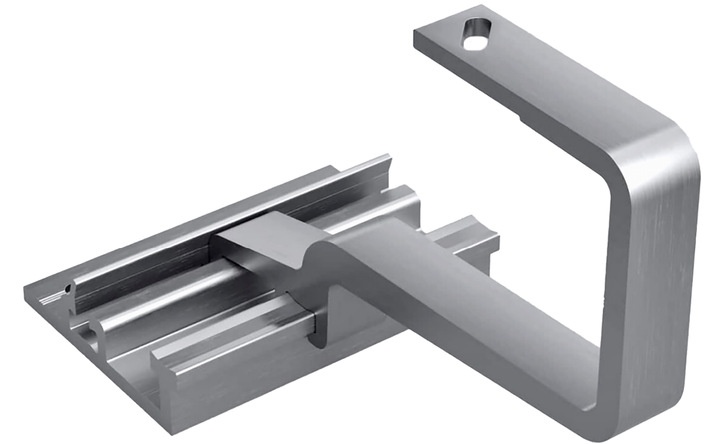 Schon bei der Grundplatte hat der Handwerker Flexibilität. Denn sie ist mit insgesamt zwölf Bohrungen ausgestattet, sodass er diese Grundplatte mittig auf den Sparren schrauben kann. Da der Bügel des Hakens danach in einen Kanal geschoben wird, der sich über die gesamte Breite der Grundplatte erstreckt, kann der Handwerker den Haken genau unter dem Wellental des Dachziegels positionieren. Das obere Ende des Bügels ist mit einem diagonalen Langloch ausgestattet, sodass der Monteur hier auch noch etwas Flexibilität hat, um die Montageschiene zu justieren.