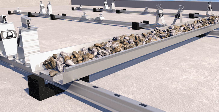 Der Vorteil: Das System stellt eine vergleichsweise günstige Ballastlösung dar, weil sich auf Flachdächern oft schon Kies befindet, der einfach in die Ballastwannen geschaufelt werden kann. Zudem hat das logistische Vorteile, weil keine Platten mehr bestellt und transportiert werden müssen.