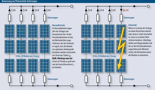 Am besten absichern lassen sich die Rückströme in den Anlagen. Teilweise kommen dabei Sperrdioden zum Einsatz, die innerhalb der Strangleitungen zu den Sammelschienen in Reihe zu den Modulen geschaltet werden. Sie werden teilweise in den Strangleitungen parallel zur Sammelschiene eingebaut, sind aber kein Ersatz für eine Strangsicherung.