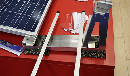 So geht der Installateur vor, bis er die gesamte Anlage aufgebaut hat. Er kann dabei mit den gleichen Bauteilen sowohl eine Süd- als auch eine Ost-West-Anlage aufbauen. Zum Schluss muss er nur noch die seitlichen Windabweisbleche montieren. Dazu sind an den Basiselementen Schnappverschlüsse angebracht. Der Monteur schiebt das Blech einfach nur über diese Verschlüsse, bis sie einrasten.