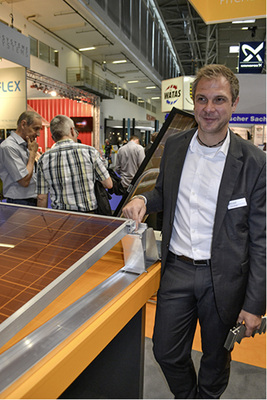 Der eidgenössische Hersteller Ernst Schweizer ist mit einem neuen Südsystem auf die Intersolar nach München gekommen. Es basiert auf dem Ost-West-System, das die Schweizer von Hilti übernommen haben. „Wir haben versucht, dass möglichst viele Komponenten gleich sind wie bei dem Ost-West-System“, betont Helge Hartwig, Technikleiter bei Schweizer Metallbau. „Wir haben bei dem neuen System die gleichen Grundplatten und die gleichen Verbindungsstreben.“ Nur die Stützen für die Montage der Module sind anders, weil sie an die Aufständerung in eine Richtung angepasst werden mussten.