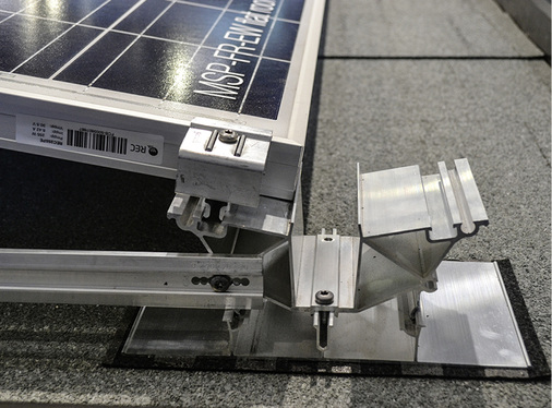 Ein ähnliches Konzept der schnellen Montage mit extrem leichten Fußprofilen verfolgt auch Esdec. Die Niederländer sind aus Deventer in der Provinz Overijssel mit ihrem neuen Flat Fix nach München gekommen. Der Name ist Programm. Es ist ein in Windeseile aufgebautes Montagesystem für das Flachdach. Die Grundlage ist ein Vierkantprofil. Auf beiden Seiten schiebt der Monteur jeweils ein Basiselement ein. Auf der einen Seite hat dieses einen hohen und auf der anderen einen niedrigen Fuß. Auf diesen werden später die Module aufgelegt. Unter die beiden Basiselemente klickt der Monteur eine sogenannte Dachstütze ein. Das ist ein runder Fuß aus einer mit Glasfasern verstärkten Kunststoffmischung, mit dem die Anlage auf dem Dach steht.