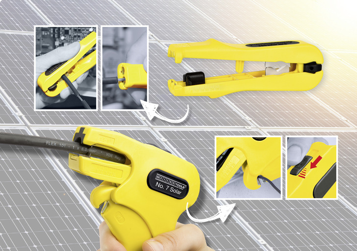 Erstens: Die Abisolierzange No. 7 Solar eignet sich für das Abisolieren der gängigen Rundkabel in der Solartechnik. Sie ermöglicht die einfache und schnelle Abisolierung zwischen 1,5 und sechs Quadratmillimeter. Die Zange verfügt über einen optischen Längenanschlag von acht bis 24 Millimeter und über eine mehrfach verstellbare Feineinstellung. Dadurch werden alle gängigen Rundkabel, die im Bereich der Solartechnik eingesetzt werden, problemlos und einfach entmantelt.