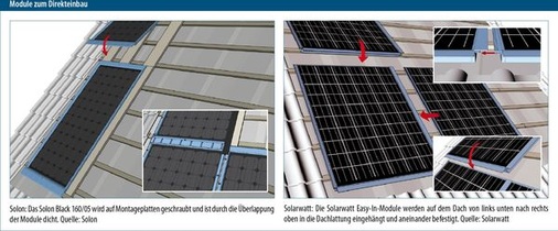 Nach Herstellerangaben kommt das Solon-Modul ohne Unterspannbahnen, Aluschienen oder Modulklammern aus. Bei der Installation werden zunächst Montagebretter mit einem vorgeschriebenen Maß vertikal auf die Dachlatten geschraubt. „Die Montagebretter sind nötig, weil wir das richtige Dachlattenmaß nicht sicherstellen können“, erläutert Frauke Roswadowski. Anschließend setzt der Monteur das Module auf die Montagebretter, richtet es seitlich parallel zur Ziegeleindeckung aus und befestigt es durch die Bohrlöcher im Rahmen hindurch mit Holzbohrschrauben auf den Montagebrettern. Danach legt er das nächste Modul über dieses erste an und so fort. Durch den Rahmen überlappen sich die Module ähnlich wie Dachziegel; das Wasser fließt direkt auf der geschlossenen Fläche ab. Die Montage des Easy-In-Systems von Solarwatt funktioniert ähnlich. Allerdings entwickelte Solarwatt nicht das komplette Modul neu, sondern lediglich einen speziellen Rahmen für seine kristallinen Standardmodule M220-60 GET AK und P210-60 GT AK. Die Produktidee stammt von dem Vertragshändler C.M.S. Energiesysteme in Nettetal.