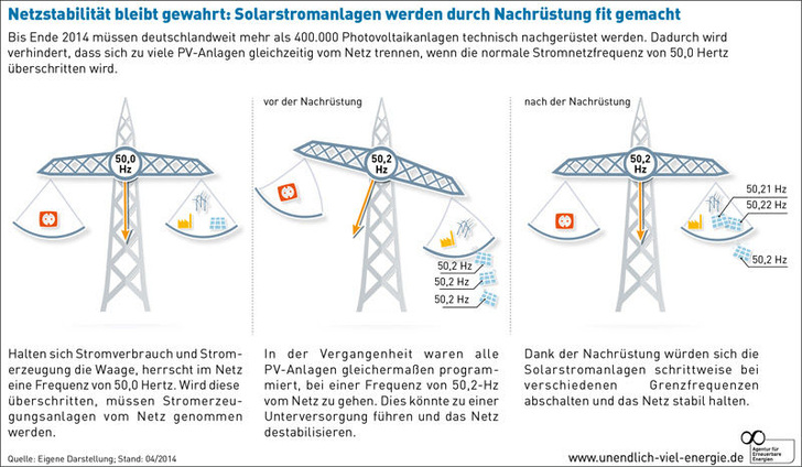 Bis Ende Mai 2014 soll die zweite Welle der 50,2-Hertz-Umrüstaktion von rund 90.000 mittelgroßen Anlagen mit einer Leistung zwischen 30 und 100 Kilowatt abgeschlossen sein. Der Rest soll bis Ende des Jahres folgen. Insgesamt müssen in Deutschland über 400.000 Photovoltaikanlagen nachgerüstet werden. Die meisten davon stehen in Bayern und Baden-Württemberg. Aber es gibt eine BagKleinanlagen unter zehn Kilowatt und seit 2012 in Betrieb genommene Anlagen sind von der Umrüstpflicht ausgenommen.