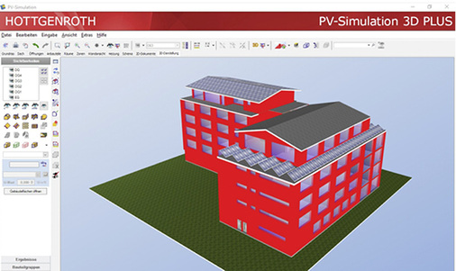 Hottgenroth bietet mit PV-Simulation 3D eine umfassende Software zur Photovoltaik-Anlagenplanung. Sperrflächen werden bei einer automatischen Vollbelegung berücksichtigt. Die Produktdatenbank ermöglicht eine Vielzahl von Berechnungskombinationen. Der Anwender kann die Modul- und Wechselrichterdatenbank zudem beliebig erweitern. Die integrierte CAD ermöglicht es, reale Dachformen und Besonderheiten nachzubilden oder einzulesen. Die Betrachtung von Batteriespeichern ist ebenfalls möglich. Die Anbindung an weitere Programme für Wärmepumpensimulationen und Gebäudesimulationen ist möglich.