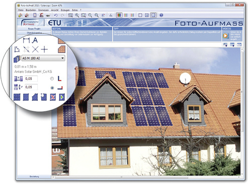 Bei Bestandsgebäuden gibt es oftmals keine Grundrisspläne oder genauen Angaben über die Gebäudehülle. Die Aufnahme der Daten und die Bestimmung der Dachflächen und Fassaden eines Gebäudes werden dadurch zeitaufwendiger. Das erleichtert die Software „Foto-Aufmaß Professional“ von Hottgenroth: Ein Foto des Gebäudes von einem Fotohandy oder einer Digitalkamera kann in der Software importiert werden. Anhand von ein oder zwei Referenzmaßen werden die Wand- und Dachflächen sowie Fenster und Türen zeitsparend ermittelt. Zusätzlich kann der Nutzer auf dem Dach Solarmodule darstellen oder den ermittelten Flächen, zum Beispiel der Fassade, per Drag & Drop eine andere Farbe geben. Die Ergebnisse können Planer vorab begutachten und Kunden direkt veranschaulichen, wie sich die Änderungen auf das Gebäude auswirken. Neu ist die Elementenliste mit der man Eingaben direkt ansehen und auch bearbeiten kann. Ebenfalls neu ist die Anzeige der Flächenbilanz. Sie ermöglicht zügig einen Überblick der erfassten Flächen eines Projektes. Zur Weiterverarbeitung der Daten sind die Schnittstellen zu Excel, PV-Simulation 3D sowie der Kaufmann- und Energieberater-Software integriert.