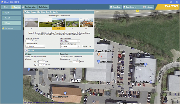 Über eine Schnittstelle werden Dachflächen nun direkt in Google Maps markiert und geplant. Nach Eingabe der Dachneigung errechnet das System die Größe der zu belegenden Dachfläche und schlägt je nach Ausrichtung die optimale Belegung vor. Über die Eingabe von Postleitzahl oder Ortsname werden automatisch auch die regionalen Normlasten für Wind und Schnee vom System übernommen. Dazu verfügt der Schletter Configurator über die weltweit umfangreichste Lastermittlungsdatenbank.