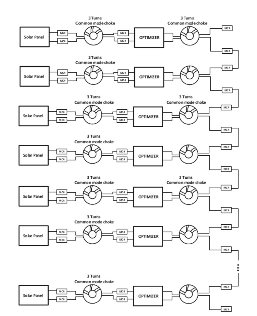 Man könnte auch vier Leiter miteinander nehmen, wie schon mal diskutiert, aber die fallen dann in die Sättigung und daher nur die jeweils zusammengehörenden zwei Leiter (also zwei zum Modul und dann die zwei auf den String raus zum nächsten Optimizer). Also heißt das, pro Optimizer vier oder bei einem Doppeloptimizer sechs Stück Ferrite (immer zwei Ferrite pro zwei Leiter).