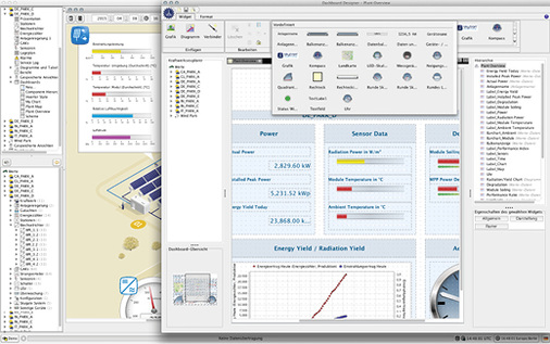 Das Highlight der aktualisierten Version 2.1 des PV-Guard sind die neu eingeführten Dashboards, auf denen alle Leistungs- und Ertragskennwerte eines Photovoltaikkraftwerks angezeigt werden. Die Anzeige des Dashboards kann entsprechend den Bedürfnissen angepasst werden. Zudem erstellen Nutzer mit dem neuen Tool ihr eigenes Anlagenschema, auf Wunsch auch mit eigenem Branding.