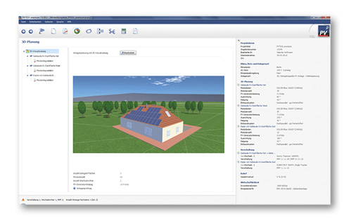 Valentin Software aus Berlin stellt auf der Intersolar die neue Planungssoftware PV Sol Premium vor. Mit einer neuen Oberfläche mit intuitiver Benutzerführung die Version ab Juni die Nachfolge des Simulationsprogramms PV Sol Expert für die detaillierte Planung und Visualisierung von Solarstromanlagen an. Wie bei den Vorgängerversionen ist die Verschattungsanalyse von Aufdach- und Freiflächenanlagen im 3D-Modus Kernstück des Programms: Es berechnet, wie häufig die Module im Durchschnitt verschattet werden und wie sich das auf den Anlagenertrag auswirkt. Die Ergebnisse werden grafisch dargestellt. Dabei lassen sich sämtliche Verschattungsobjekte frei wählen und beliebig im Gelände oder auf dem Gebäude platzieren. Zu den neuen Features zählt die genaue Berücksichtigung des Eigenverbrauchs, denn PV Sol Premium bildet im Unterschied zu den Vorgängerversionen auch die Stromspeicherung in Batteriesystemen ab. Stromlastgänge importiert das Programm auf der Basis von Stunden-, Viertelstunden- oder Minutenwerten, was die Eingabe des Lastverlaufs erheblich erleichtert. Außerdem ist die Anzahl der möglichen Teilgeneratoren pro Solaranlage nun beliebig groß, was die Flexibilität und die maximale Anlagengröße erhöht. Nutzer können unterschiedliche Wechselrichter auswählen und beliebig miteinander kombinieren. Die automatische Verschaltung zeigt in Sekundenschnelle alle sinnvollen Wechselrichterkombinationen auch im 3D-Modus an.
