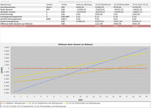 Da der Schweizer Hersteller der Software auch Solarthermieplanung integriert hat, kommt diese Funktionalität besonders hybriden Systemen zugute: Für komplexe Fragestellungen – Photovoltaik, Solarthermie, Wärmepumpe eventuell in Kombination mit Gasversorgung – gibt es bei Polysun benutzerfreundliche und klare Antworten. Neben dem Vergleich mehrerer Varianten können die Resultate auch als CSV exportiert werden.