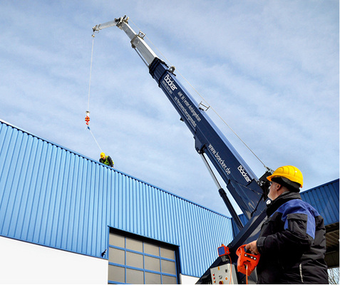 Die Firma Böcker vertreibt einen Kran mit Personensicherungsmodus. Der Anhängerkran AHK 36 erreicht Ausfahrlängen von bis zu 36 Metern und hebt bis zu 2.400 Kilogramm Last. Im Personensicherungsmodus kann der Kran bei Reparaturen auf dem Dach für die Absturzsicherung von Personen eingesetzt werden. Am Lasthaken des Krans hängt ein Sicherungsgerät, das die Person über ein Drahtseil innerhalb eines gewissen Aktionsradius mit dem Kran verbindet. Wird der Kran zur Personensicherung genutzt, muss eine zweite Person am Boden den Kran mitführen. Zudem ist in diesem Fall die Fernbedienung kabelgebunden – damit der zweite Mann am Boden nicht weggehen kann. Diese Lösung wurde gemeinsam mit der Berufsgenossenschaft entwickelt.